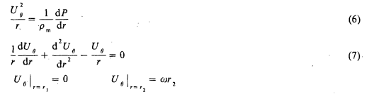 式中,Uθ為柱狀坐標(biāo)中沿θ方向上的線速度;P為圓柱環(huán)中的壓力;這里r代表徑向坐標(biāo);r1為軸承外半徑;r2為軸承外殼體內(nèi)半徑。式(7)為歐拉方程,令r=et(t為中間變量),則t=1nr,對(duì)應(yīng)式(7)的特征方程為