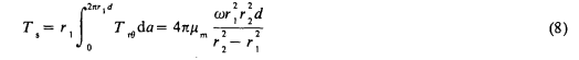 文獻(xiàn)認(rèn)為流體在兩個(gè)葉片之間流動(dòng)時(shí),軸承外表面上的作用力與軸平行。實(shí)際上,流體是以一定角度通過(guò)葉片的,所產(chǎn)生的阻力矩不能忽略。采用與式(3)類似的動(dòng)量方程,軸表面上的速度取x的四次冪分布(W=Cx4),可以得出Ta的表達(dá)式為