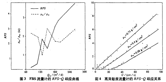 多相流動(dòng)中,U和μm/ρm隨溫度、壓力、油氣水的含量的變化而變化。圖3是利用斯倫貝謝的FBS流量計(jì)由實(shí)驗(yàn)作出的RPS-Q響應(yīng)曲線,從圖中可見(jiàn),隨μm/ρm的突變,RPS值也發(fā)生了響應(yīng)的劇烈變化。
