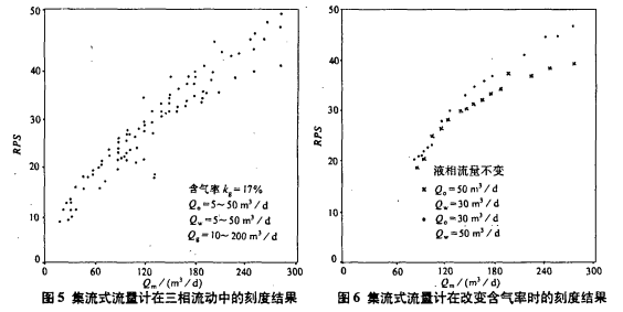 圖5是對(duì)斯倫貝謝公司的集流式流量計(jì)進(jìn)行刻度的結(jié)果。實(shí)驗(yàn)所用油、水的密度分別為0.825g/cm³和1g/cm³,用空氣模擬天然氣,油、水、氣的流量變化范圍,考慮了常見(jiàn)油氣水產(chǎn)量和含量的變化。從圖中可見(jiàn),實(shí)驗(yàn)數(shù)據(jù)的線性關(guān)系良好。圖6是液相流量不變,含氣率在10%~70%間變化時(shí)的刻度結(jié)果。在總流量(Qm)變化范圍為80~300m³/d時(shí),油水比的變化對(duì)RPS-Q響應(yīng)影響不明顯。因此,多相流動(dòng)中確定總流量的可靠方法是采用集流式流量計(jì)。