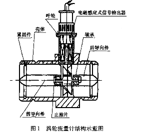 ①法蘭夾裝式液體渦輪流量計(jì):渦輪流量計(jì)是一種流量測(cè)量?jī)x表,流動(dòng)流體的動(dòng)力驅(qū)使渦輪葉片旋轉(zhuǎn),其旋轉(zhuǎn)速度與體積流量近似成比例(線(xiàn)性關(guān)系)。信號(hào)輸出方式包括脈沖、模擬量或數(shù)字通信方式。結(jié)構(gòu)原理見(jiàn)圖1。