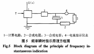 經(jīng)過整形后的輸入頻率(脈沖)作用于計(jì)算電路的輸入端T,使電路中交替出現(xiàn)截止或?qū)▋煞N狀態(tài),放大器輸出端脈沖波形被整形,與T的波形相反,當(dāng)放大電路出現(xiàn)截止?fàn)顟B(tài)時(shí),電源E通過外圍電路(或集成內(nèi)部)在儲能電容C中預(yù)存電荷;當(dāng)放大電路出現(xiàn)導(dǎo)通狀態(tài)時(shí),C預(yù)存的電荷通過外圍電路(或集成內(nèi)部)迅速釋放。就這樣輸入的頻率(脈沖)經(jīng)過電子電路改變?yōu)榕c之相對應(yīng)的電流信號。電路里的電流指示儀表4即刻顯示該計(jì)量電流值I的多少,I=q/T,而q=C·E,f=1/T(q為一個脈沖周期電容所充電荷量;C為電容量;E為電源電壓值;f為充放電頻率)。合并三式可得到公式(6):