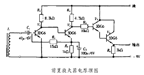 當(dāng)被測(cè)介質(zhì)(液體)通過變送器時(shí),推動(dòng)渦輪旋轉(zhuǎn),由于螺旋狀的渦輪是由導(dǎo)磁材料制成,所以旋轉(zhuǎn)后會(huì)周期性地增減線圈的磁通量,通過線圈感應(yīng)出頻率與流量成正比的脈沖電信號(hào)。此電信號(hào)較弱(約20mV~500mV),需經(jīng)前置大器放大(放大倍數(shù)約為,400左右)后,再送給流量指示、累積儀表處理。變送器由機(jī)械裝置(渦輪、導(dǎo)流件、殼體等)和電子裝置(前置放大器)組成。前置放大器安裝在殼體上部,兩裝置之間通過螺紋連接。前置放大器的電原理如下圖所示,共由四級(jí)電路組成,前兩級(jí)是電壓放大,后兩級(jí)是射*組合輸出。
