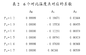 Z值可根據(jù)通用曲線圖確定或利用狀態(tài)方程算出。為計(jì)算方便,多采用對(duì)曲線進(jìn)行二次擬合的方法來近似求得Z值。在求解Z值的時(shí)候,在所研究的對(duì)比溫度的范圍內(nèi)選取了6個(gè)均勻分布于研究范圍內(nèi)的Tr點(diǎn)為參照點(diǎn)(見表2),得到Z與Pr之間的簡(jiǎn)單函數(shù)關(guān)系。通過數(shù)據(jù)分析,利用*小二乘法對(duì)曲線進(jìn)行擬合,得到Z求值公式如下: