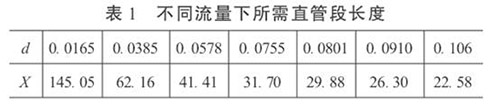 3.直管段長度和衛(wèi)生型液體渦輪流量計精度的初步預(yù)測在工程設(shè)計中,根據(jù)流體性質(zhì)、流量和雷諾數(shù)確定α和d值。這樣,按照式(5)就可以依不同的流量計精度要求,對直管段長度進(jìn)行初步預(yù)測,或確定直管段長度后,對流量計的精度做初步預(yù)測。當(dāng)δ= 0.2%時,不同流量下所需直管段長度見表1。