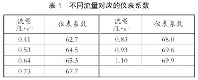 其中自變量為流量,因變量為儀表系數(shù)。當(dāng)流量介于0.4~1L/s時(shí),采用式(1)進(jìn)行計(jì)算;當(dāng)流量超過(guò)1.1L/s時(shí),保持儀表系數(shù)恒為69.9。