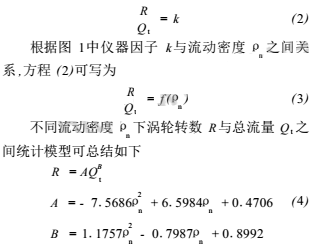 圖1為傘集流條件下渦輪流量計在油氣水三相流條件下渦輪轉(zhuǎn)速與配比三相流流動密度ρn及總流量Qt之間的實驗關(guān)系。油氣水三相流流動密度ρn定義