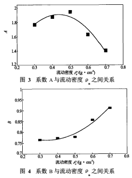 式中,系數(shù)A與B均隨流動密度ρm變化,圖3及圖4給出了其實驗擬合關(guān)系。為了從方程(4)中求解得到油氣水三相流總流量,需要根據(jù)密度-持水率計測量數(shù)據(jù)確定三相流流動密度ρm的數(shù)學(xué)模型。
