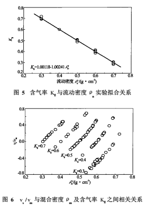 比值vs/vm與混合密度ρm、含氣率Kg之間的實驗擬合關(guān)系(見圖6)??梢钥闯鰧τ谙嗤暮瑲饴蔏g,vs/vm隨著混合密度ρm的增大而增大,從物理上可以理解為隨著氣液流型向泡狀流方向發(fā)展,其相間滑脫影響也逐漸增大。