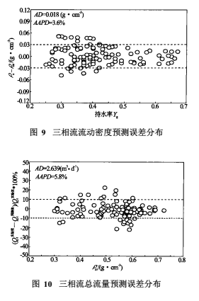 其中,系數(shù)C及D隨含氣率Kg的實驗擬合關(guān)系如圖7及圖8所示。聯(lián)立式(10)、(11)及(12),采用迭代求解法就可以計算得到三相流流動密度值。圖9為計算得到的流動密度與模擬井實驗標(biāo)定的流動密度比較結(jié)果??梢钥闯觯^大部分實驗點的流動密度預(yù)測偏差落在-0.03與0.03誤差線之間(圖9中ρnn表示預(yù)測流動密度,ρn為模擬井標(biāo)定流動密度),其絕對平均誤差為AD=0.018g/cm³,絕對平均相對誤差為AAPD=3.6%,與圖2所示的實驗關(guān)系相比,其三相流流動密度的預(yù)測精度是令人滿意的。聯(lián)立方程(4)、(10)、(11)及(12)式,采用非線性方程組迭代解法就可以預(yù)測得到三相流總流量。圖10為預(yù)測總流量誤差結(jié)果,其絕對平均誤差為AD=2.639m³/d,絕對平均相對誤差為AAPD=5.8%,取得了較高精度的油氣水三相流總流量預(yù)測結(jié)果。
