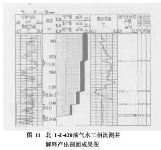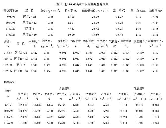 用本文提出的總流量預(yù)測模型共處理了8口含氣油井的三相流測井資料。圖11為北1-2-420井三相流測井資料處理實例,其解釋結(jié)果見表1。經(jīng)對8口含氣油井的實際處理效果表明,傘集流三相流測井組合儀可以較準(zhǔn)確地確定油井油氣水三相流產(chǎn)出剖面。