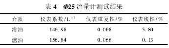 依據(jù)表3測(cè)試數(shù)據(jù),經(jīng)計(jì)算可得,Φ25流量計(jì)在滑油及燃油中測(cè)試結(jié)果如表4所示,測(cè)試線形圖如圖3所示。