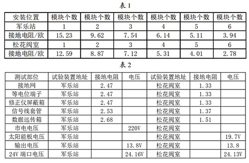 接地網(wǎng)的安裝與連接:接地網(wǎng)是整個(gè)液體渦輪計(jì)量表防雷試驗(yàn)比較關(guān)鍵的一個(gè)內(nèi)容,能不能準(zhǔn)確的論證試驗(yàn)的有效性,必須保證接地網(wǎng)達(dá)到標(biāo)準(zhǔn)的接地電阻,通過(guò)對(duì)實(shí)地地電阻率的測(cè)試,初步選擇6個(gè)接地模塊埋設(shè)并配用降阻劑使用,邊安裝邊測(cè)試直到達(dá)到標(biāo)準(zhǔn)值后才引入等電位箱。在軍樂(lè)站和松花閥室安裝模塊并測(cè)試數(shù)據(jù)見(jiàn)表1。