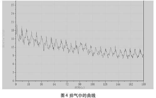圖4、圖5中所示曲線為測量過程中所截取的集流傘中所聚集的氣相,通過排氣通道排出時與排出后的測量曲線。測試過程中錄取到的儀器排氣的過程,當集流傘完全支開后仍需要開啟流量測試進行實時檢測,否則可能會錄取資料失真。