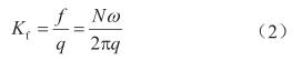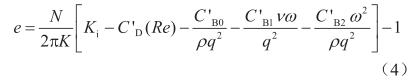 式中q表示體積流量,m3/s;ν表示介質(zhì)的運動黏度,m2/s;雷諾數(shù)Re=4q/(πdν);d表示流量計口徑,m;ρ表示介質(zhì)的密度,kg/m3;C'D、C'B0、C'B1和C'B2分別表示4個待定系數(shù),在某個流量點下標定出的儀表系數(shù)(Kf,表示單位體積流體通過流量計時,流量計輸出的脈沖數(shù),1/m3)和轉(zhuǎn)子葉片頻率(f,s-1)的關(guān)系為: