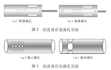 防砂卡防爆渦輪流量計(jì)結(jié)構(gòu)如圖1所示,主要由防爆渦輪流量計(jì)、篩狀出液孔、防爆渦輪流量計(jì)安裝短接、解卡管、解卡管開槽、中心管、長(zhǎng)條孔(銷釘運(yùn)動(dòng)槽7)、薄壁筒、進(jìn)液孔、解卡管固定銷釘、含水傳感器安裝筒組成。采用等效面法,將進(jìn)液孔一分為二,改為寬2mm的矩形進(jìn)液孔,解決從進(jìn)液孔進(jìn)入的長(zhǎng)垢片或大垢片造成的砂卡,如圖2所示。將原先3個(gè)方型的出液孔改為直徑4mm的陣列狀的篩孔,解決儀器在下井過程中從出液孔進(jìn)入儀器的長(zhǎng)垢片、大垢片造成的砂卡,如圖3所示。