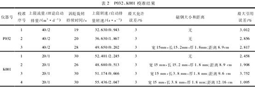 由表2可知,解卡裝置末端粘貼寬15mm、長(zhǎng)15.2mm、厚1.8mm的弧形磁鋼,安裝距離防爆渦輪流量計(jì)磁鋼8.9cm時(shí),P032*3次渦輪葉片轉(zhuǎn)動(dòng)持續(xù)時(shí)間28s,40m3/d平均轉(zhuǎn)速49.650r/s;同樣的磁鋼大小和安裝距離,K001*2次調(diào)試渦輪,葉輪轉(zhuǎn)動(dòng)持續(xù)時(shí)間26s,*大引用誤差1.908%合格,啟動(dòng)排量1m3/d時(shí),平均轉(zhuǎn)速0.513r/s,不合格。K001*3次,解卡裝置末端粘貼寬15mm、長(zhǎng)3.8mm、厚1.8mm的弧形磁鋼,安裝距離防爆渦輪流量計(jì)磁鋼9.6cm,渦輪沒有調(diào)試持續(xù)時(shí)間30s,但校準(zhǔn)結(jié)果*大引用誤差3.752%不合格,啟動(dòng)排量1m3/d沒有啟動(dòng),平均轉(zhuǎn)速0.666r/s不合格。K001*4次,重新調(diào)試渦輪,持續(xù)時(shí)間30s,同時(shí)將寬15mm、長(zhǎng)3.8mm、厚1.8mm的弧形磁鋼,距離防爆渦輪流量計(jì)磁鋼的距離調(diào)整為12.16cm,*大引用誤差1.095%,啟動(dòng)排量1m3/d啟動(dòng),平均轉(zhuǎn)速2.587。故*終確定弧形磁鋼寬15mm、長(zhǎng)3.8mm、厚1.8mm,距離防爆渦輪流量計(jì)磁鋼的距離為12.16cm。此時(shí)在流量計(jì)啟動(dòng)排量時(shí),渦輪葉片轉(zhuǎn)動(dòng)。