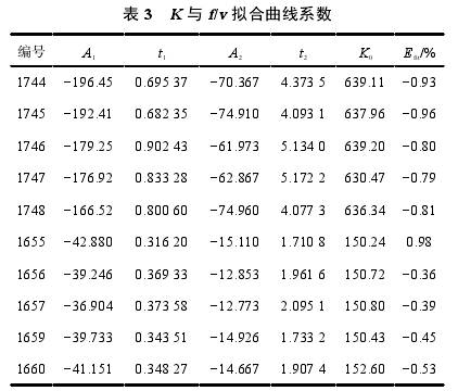 利用雙指數衰減函數對儀表系數與雷諾數關系進行擬合,在層流范圍內(Re<2300),儀表系數隨Re增加迅速增加,尤其是在Re<1000范圍內更加明顯;而在Re>3000紊流范圍內,儀表系數變化平緩,接近常數;在1000