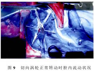 圖9記錄的是切向渦輪正常轉(zhuǎn)動時的流場,圖9中水從左向右流動,實驗時水速較快(1m3/d),渦輪葉片順時針轉(zhuǎn)動。水速變大后,擾動變大,不再是無旋繞角流動,腔體1中流體形成一個運動的旋渦,導(dǎo)致腔內(nèi)壓強分布不再對稱,產(chǎn)生壓差,致使渦輪葉片轉(zhuǎn)動,旋渦在隨葉片運動到腔體2中時逐漸耗散消失。數(shù)值仿真的計算結(jié)果與物理實驗的結(jié)果基本一致。