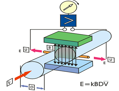 用水流量計工作原理是法拉*電磁感應(yīng)定律,即導(dǎo)體在磁場中切割磁力線運動時,在導(dǎo)體兩端會感應(yīng)一個與磁場方向和導(dǎo)體運動方向相互垂直的感應(yīng)電動勢。感應(yīng)電動勢的大小與感應(yīng)強度和運動速度成正比。導(dǎo)電性液體在垂直于磁場的非磁性測量管內(nèi)流動,與流動方向垂直的方向上產(chǎn)生與流量成比例的感應(yīng)電勢,其值如下式: