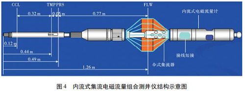 1. 2 內(nèi)流式集流甲醇計量表如圖 4 所示,內(nèi)流式集流電磁組合測井儀主要采用內(nèi)流式集流甲醇計量表,并組合了井溫壓力磁定位儀。利用電磁感應(yīng)原理測量平均流速,體積流量計算公為: