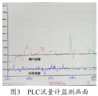 通過圖3 PLC 流量計(jì)監(jiān)測畫面可以看出,PLC 上輔汽測量用的氣體渦輪流量表的量程設(shè)置為30t/h,現(xiàn)場設(shè)備量程實(shí)際為6t/h,兩者嚴(yán)重不符,因此測量值4t/h 為錯(cuò)誤值(單臺機(jī)組運(yùn)行),需要對程序進(jìn)行修改。