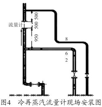 根據(jù)圖1渦街流量安裝要求示意圖及廠家的設(shè)備說明書要求,流量計(jì)上游的直管段長度至少為20D≈1 300mm,下游的直管段至少在5D≈325mm,D=65mm 為管道直徑。圖4為冷再蒸汽流量計(jì)現(xiàn)場安裝圖,流量計(jì)上游僅為950mm<1600mm,此流量計(jì)安裝位置有誤,對測量值有一定的影響,造成測量偏差,需調(diào)整流量計(jì)的安裝位置。