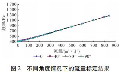 為了考察井眼斜度變化對測河水流量計測量流量的影響,開展了非集流測河水流量計在不同斜度情況下的流量測量模擬實驗。模擬實驗在大慶油田多相流實驗室進行,儀器外徑 38 mm,模擬井筒內(nèi)徑為 124 mm,實驗介質(zhì)是水,傾斜角度分別為 0°、40°、80°和 90°( 水平) ,流量范圍為 5 ~ 850 m3 /d。實驗結(jié)果表明,在儀器居中條件下,井眼斜度變化對測河水流量計的儀表常數(shù)沒有影響,滿量程誤差不大于 4% ,因此可以應(yīng)用測河水流量計進行水平井注水剖面測量。不同角度情況下的實驗結(jié)果如圖 2 所示。
