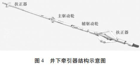 水平井注水井注入剖面測井工藝原理如圖 3 所示。在垂直井段,儀器在重力作用下可以通過注入管柱下入到井內(nèi),注入管柱下端須裝有喇叭口,且喇叭口應(yīng)在造斜點以上,保證測井完成后儀器順利起出,不發(fā)生卡儀器問題。儀器通過喇叭口以后在重力作用下繼續(xù)向下移動,當儀器不能靠重力下移時,啟動牽引器,利用牽引器將儀器推送到井底,上提電纜過程中進行測井。