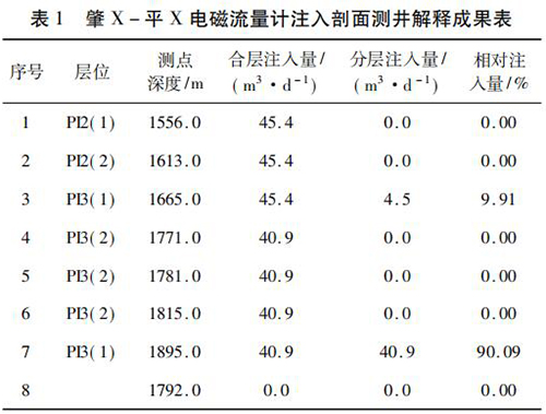 2017 年 9 月在大慶油田采油八廠肇 X - 平 X 水平井注水井中*次進行了水平井注入剖面測井現(xiàn)場試驗。該井斜深2 055. 42 m,水平段長度為568. 46 m,試驗?zāi)康氖峭ㄟ^注入剖面測井了解該井各層段的注水情況,同時對水平井測井工藝、儀器的適用性、井下牽引器及井口輔助裝置等設(shè)備的工作有效性和可靠性進行評價。現(xiàn)場試驗中,在密閉條件下錄取到了該井的注入剖面測井資料,進行了重復(fù)測量,重復(fù)測量結(jié)果在誤差允許范圍內(nèi),測井成果見表 1。該井施工壓力 6. 0 MPa,注入量45. 4 m3 /d,有 7 個射孔層,分 8 個測點測量,2 個層有吸入顯示,其中,P13( 1) ( 1 734 ~ 1 767 m) 層絕對吸入量4. 5 m3 /d,相對吸入量為9. 91 %,P13( 1) ( 1 899 ~1 943 m)層絕對吸入量 40. 9 m3 /d,相對吸入量為 90. 09% ,測井成果見表 1。通過與甲方的交流,再結(jié)合該井的動靜態(tài)資料及周圍井的工作狀況,采油廠的地質(zhì)人員認為本次測井結(jié)果能比較準確地反映該井的注入情況。