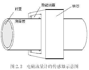 傳感器的主要作用是將通過管道的流量信號(hào)進(jìn)行轉(zhuǎn)換,將其轉(zhuǎn)為電動(dòng)勢(shì)。市面上常見的傳感器主要有下圖 2.4 中如測(cè)量管、鐵芯、勵(lì)磁線圈、襯里等結(jié)構(gòu)。
