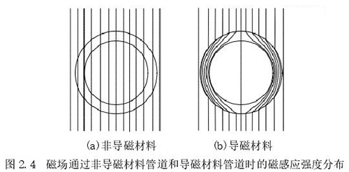 1.測(cè)量管:主要是傳感器的管道,該管道由高導(dǎo)電率非導(dǎo)磁材料制成,可保證流體在通過時(shí)能夠表現(xiàn)出自身的電磁效應(yīng),在該管道內(nèi)中安裝了內(nèi)襯。使用非導(dǎo)磁材料的原因是保證勵(lì)磁線圈中所產(chǎn)生的磁場(chǎng)不會(huì)順著管道流走,確保測(cè)量管道內(nèi)部產(chǎn)生明顯的磁感應(yīng)線,下圖 2.4 中展示了利用非導(dǎo)磁材料和導(dǎo)磁材料管道中所產(chǎn)生磁感應(yīng)線的情況。