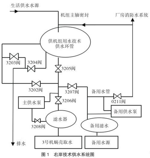 大化電廠技術(shù)供水包括右岸和左岸供水,本文以右岸 3 號機(jī)技術(shù)供水系統(tǒng)增設(shè)帶現(xiàn)場顯示燃油流量表技術(shù)改造方案為例進(jìn)行分析說明。右岸技術(shù)供水系統(tǒng)(見圖 1)由各機(jī)組單元蝸殼取水主水源、濾水器、主供水泵、正反向切換閥(3202 閥與 3204 閥開為反向取水,3203 閥與 3205閥開為正向取水,運(yùn)行時只開其中一種)、備用水源、備用濾水器、備用供水泵和備用總水管構(gòu)成一個整體,并通過 0211 閥與廠房消防水系統(tǒng)相連接,可通過主水源自流供水、主水源水泵增壓供水、備用水源自流供水、備用水源水泵增壓供水等不同供水方式向機(jī)組推力軸承冷卻器和發(fā)導(dǎo)軸承冷卻器、水導(dǎo)軸承冷卻器、發(fā)電機(jī)空氣冷卻器提供冷卻水源。機(jī)組技術(shù)供水正常運(yùn)行采用單元蝸殼取水的供水方式運(yùn)行,以備用水源供水為輔。機(jī)組主軸密封用水分別取自生活供水水源和技術(shù)供水備用總管水源,向機(jī)組大軸提供可調(diào)水壓端面密封水源。在現(xiàn)場配置一個技術(shù)供水現(xiàn)地單元柜,實(shí)現(xiàn)對機(jī)組技術(shù)供水系統(tǒng)設(shè)備自動控制、故障保護(hù)及報警。柜內(nèi)配置可編程 PLC 控制系統(tǒng),電控柜對主供增壓泵、3202 至 3208 電動碟閥進(jìn)行流程控制。