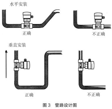 現(xiàn)場安裝時應(yīng)注意遠(yuǎn)離可能對其產(chǎn)生干擾的大型設(shè)備,防止長期的熱輻射和其他如磁場直射等環(huán)境影響。為確保高測量精度和較好的零點(diǎn)穩(wěn)定性,進(jìn)行校正前,燃油流量表應(yīng)裝入工藝介質(zhì)中至少 24 小時電*鈍化。安裝的管路設(shè)計應(yīng)確保管道始終充滿流體,防止測量誤差,管路設(shè)計圖見圖 3。