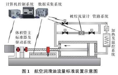 圖1是航空潤滑油流量校準裝置示意圖。裝置采用伺服電機驅(qū)動標準計量油缸的結(jié)構(gòu)形式,主要由計量油缸、電機及控制器、滾珠絲杠、直線導(dǎo)軌、校準管路、切換閥門、油箱、控溫機組、溫度壓力傳感器、精密光柵尺、數(shù)據(jù)采集系統(tǒng)、控制計算機等部件構(gòu)成。裝置采用伺服電機驅(qū)動標準計量油缸產(chǎn)生標準流量源,計量油缸同時作為容積標準,與光柵配合構(gòu)成流量測量系統(tǒng)。校準裝置通過調(diào)節(jié)控制介質(zhì)溫度而改變介質(zhì)粘度。標準裝置技術(shù)指標為:流量范圍:0.5~160L/min;擴展不確定度:0.05%(k=2);溫度范圍:20~120℃。