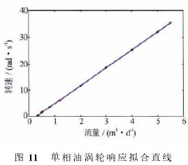 采用同樣的方法,對單相油條件下渦輪響應規(guī)律進行研究(見圖11),測得單相油的啟動排量為0.08m3/d。對單相油的實驗結果進行擬合,可得單相油的響應曲線為ω=6.73Q-6.72。與水對比而言,油的擬合曲線斜率更大,即隨著流量增加轉速增加得略快。