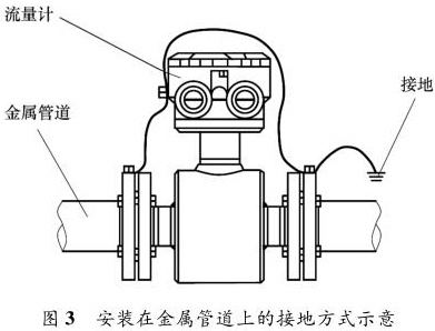 純化水流量表安裝在金屬管道上,安裝時將金屬管道與純化水流量表相連接,接地線再接入接地網(wǎng),如圖 3 所示。