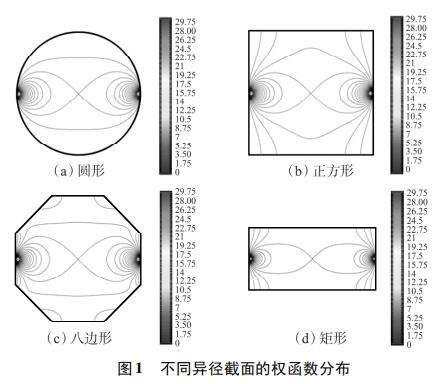 為考察不同異徑截面權(quán)函數(shù)分布的均勻性,使用上述方法對(duì)圓形、正方形、八邊形和矩形異徑截面的權(quán)函數(shù)分布進(jìn)行定性分析。為了便于對(duì)比,設(shè)置管道口徑為DN100,異徑部分截面積為3200mm2。所以,圓形異徑面半徑為32mm,正方形異徑面邊長(zhǎng)為56.6mm,八邊形異徑面邊長(zhǎng)為25.8mm,矩形異徑面長(zhǎng)寬為80×40mm。仿真結(jié)果如圖1所示,為了便于對(duì)比,權(quán)函數(shù)等勢(shì)線大小從0開始,以0.25為步長(zhǎng)遞增到30。由圖1(a)~圖1(d)可知,矩形異徑截面的權(quán)函數(shù)等勢(shì)線間距*大,即權(quán)函數(shù)變化梯度*小,權(quán)函數(shù)分布*均勻。