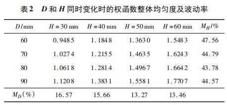 分別對(duì)上述結(jié)構(gòu)進(jìn)行有限元分析,根據(jù)式( 10) 計(jì)算 xy平面內(nèi)權(quán)函數(shù)整體均勻度 R,根據(jù)式( 11) 計(jì)算權(quán)函數(shù)隨 H變化的波動(dòng)率 MH,隨 D 變化的波動(dòng)率 MD,結(jié)果如表 2 所 示。