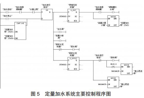 定量加水系統(tǒng)的工作過程為:當(dāng)設(shè)定好加水量后,啟動系統(tǒng),多級離心泵 10、回流閥 4、出水閥 9 和流量計前閥 12開啟對管路進行預(yù)填充;延時 30s 預(yù)填充完成后,回流閥 4關(guān)閉,調(diào)制罐補水閥 14 開啟,同時質(zhì)量流量計 13 開始計量;當(dāng)質(zhì)量流量計的累積量與設(shè)定加水量一致時,出水閥 9 和調(diào)制罐補水閥 14 關(guān)閉;調(diào)制罐定量加水完成后,開啟回收閥17 和回流閥 4 以及同未關(guān)閉流量計前閥 12 一起,利用壓縮空氣對管道中水實現(xiàn)回收;延時 30s 水回收完成后,關(guān)閉多級離心泵、球閥 4、12 和 17,定量加水過程完成。定量加水系統(tǒng)主要控制程序如圖 5 所示。