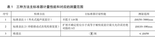 本規(guī)范包含三種校準(zhǔn)方法,分別為標(biāo)準(zhǔn)表法 1(外夾式超聲流量計(jì))、標(biāo)準(zhǔn)表法 2(串聯(lián)移動式在線校準(zhǔn)裝置)和稱重法,編制組對每種方法進(jìn)行了大量的實(shí)驗(yàn),并積*與熱水流量計(jì)生產(chǎn)廠家及用戶溝通探討,積累了豐富的經(jīng)驗(yàn),獲得了大量的實(shí)驗(yàn)數(shù)據(jù),*終確定三種方法的主標(biāo)準(zhǔn)器計(jì)量性能和對應(yīng)的測量范圍,如表 1 所示。