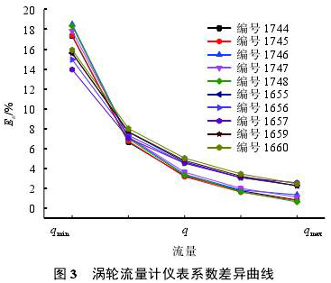 由圖2可知,不同粘度點下流量計儀表系數(shù)差異很大,圖3是10支流量計各流量點儀表系數(shù)誤差曲線。儀表系數(shù)差異通過式(1)計算。結(jié)果顯示,在低流量點儀表系數(shù)*大相差18%以上,在高流量點儀表系數(shù)*小相差約1%。