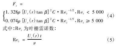 式中:Cl和Cd為葉柵的升力系數(shù)和阻力系數(shù),二者可通過不可壓縮勢流的方法計算,與葉片翼型、葉輪轉(zhuǎn)速、來流速度和半徑位置等參數(shù)相關(guān)。
