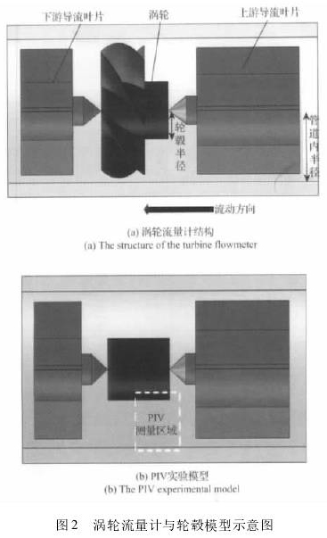 實驗在中國科大水平循環(huán)水實驗平臺上進行,實驗采用20mm口徑的柴油計量表,量程范圍是1~80方/天,其中較好線性段范圍是5~50方/天,流量計渦輪為等重疊度渦輪(不同半徑位置葉柵重疊度相同),具體參數(shù)如表1所示,這種流量計在大慶油田的生產(chǎn)測井中廣泛應(yīng)用,其結(jié)構(gòu)如圖2(a)所示。來流經(jīng)過一段導(dǎo)流葉片整流后進入渦輪的環(huán)空空間,驅(qū)動葉輪轉(zhuǎn)動,輸出響應(yīng)信號。在柴油計量表的線性響應(yīng)區(qū)間中,處于穩(wěn)定轉(zhuǎn)動時渦輪葉片對流體的干擾較少,相對來流攻角較小,對流體的軸向速度分布基本沒有影響,僅會稍稍增加其周向轉(zhuǎn)速。因而為了測量柴油計量表入口速度分布,特別制作了各參數(shù)與實際渦輪相同但并無葉片的透明外殼輪轂?zāi)P停鐖D2(b)所示,通過PIV手段,對管道中軸面上輪轂和管壁之間的區(qū)域的軸向速度分布進行剖面測量。輪轂?zāi)P桶惭b在待測柴油計量表的上游,相距超過2m以保證二者之間無相互干擾。實驗流速范圍在5~25方/天,在管路下游采用時間-質(zhì)量法獲得真實流速,通過光學(xué)觀測獲得柴油計量表葉輪的真實轉(zhuǎn)動頻率,同時采用PIV技術(shù)測量輪轂?zāi)P椭械乃俣确植肌?br />
