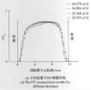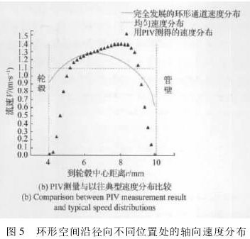 實驗中流量計的渦輪輪轂半徑為4mm,而管道內(nèi)徑為10mm,因而速度分布都在這6mm的區(qū)間內(nèi)。通過圖像處理可以獲得32個不同位置的速度,在此基礎(chǔ)上進行插值即可獲得整個環(huán)空流場的軸向速度分布。圖5(a)反映了實驗所測得的幾個不同工況點的軸向速度分布,從圖中可以看出,流速在中間位置較高,由于邊界層的影響,在靠近輪轂和管壁附近流速逐漸趨近于零。隨著流速的升高,整體速度分布向管壁方向偏移,速度*大值位置半徑增大,輪轂表面邊界層厚度增加,管壁表面邊界層厚度減少。與Xu采用LDA測量的結(jié)果相比,本文結(jié)果在半徑較大處速度較高,二者的不同結(jié)果也反映了不同設(shè)計的柴油計量表入口速度分布存在差異。相比LDA而言,PIV可以更加全面地獲得輪轂與管壁之間的流速分布信息。