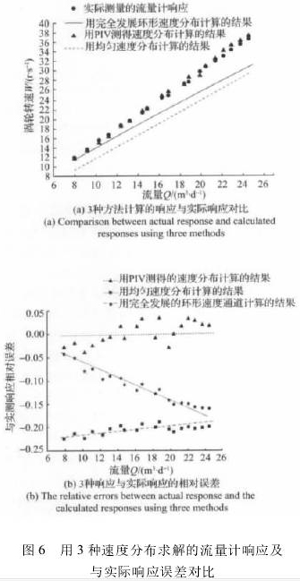 分別計算各個響應(yīng)在不同流量點處與真實響應(yīng)的相對誤差,結(jié)果如圖6(b)所示。從圖中可以明顯看出,用PIV獲得的速度分布計算的結(jié)果與實際響應(yīng)的相對誤差*小,在3%以內(nèi);用均勻入口速度分布計算的結(jié)果誤差*大;用完全發(fā)展的環(huán)形通道速度分布當(dāng)雷諾數(shù)超過2000時,由于計算模型假設(shè)由層流的速度分布直接轉(zhuǎn)變?yōu)橥牧鞯乃俣确植寄P?,未能合理地反映實際流動中逐步轉(zhuǎn)變的過渡階段,導(dǎo)致理論結(jié)果與實際速度分布有較大差異,所以誤差較大。通過這些對比不難看出,獲得真實的速度分布能更為準(zhǔn)確地計算柴油計量表的實際響應(yīng)。面對復(fù)雜的上游來流條件,PIV結(jié)果更能反映柴油計量表內(nèi)部流動的主要特征,這也從另一個側(cè)面表明,對柴油計量表內(nèi)部復(fù)雜流動的精細(xì)測量和深入認(rèn)識也將是完善相關(guān)理論和進一步優(yōu)化其性能的重要途徑。