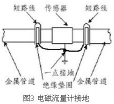 (4)盡量避開振動源、磁源(大功率電機(jī)、變壓器)由于樹脂計(jì)量表的測量感應(yīng)電壓很小,電壓較低,易受外界電磁噪聲的影響,故在安裝時(shí)應(yīng)進(jìn)行可靠的接地連(跨)接。金屬管道樹脂計(jì)量表接地連(跨)接方法如圖3所示