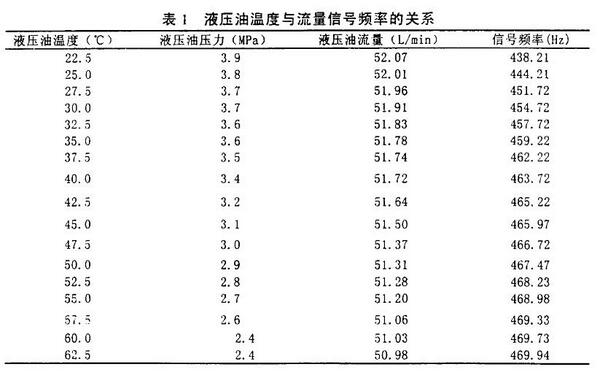 選用金湖凱銘儀表九廠生產(chǎn)的LW一15 型渦輪流量變送器進(jìn)行試驗(yàn), 該變送器出廠時, 是用常溫的水進(jìn)行標(biāo)定的, 流量范圍為0.6~4 擴(kuò)/ h , 平均儀表常數(shù)為4 70.90( H z / L ), 線性度為0.3 2%, 精度為0.5 級, 因所測介質(zhì)( 液壓油)與常溫的水性質(zhì)不同, 儀表常數(shù)應(yīng)加以修正, 或重新用實(shí)際所測的介質(zhì)標(biāo)定。試驗(yàn)在我校工程學(xué)院液壓試驗(yàn)室中的多功能液壓試驗(yàn)臺上進(jìn)行, 將被試驗(yàn)的渦輪流量變送器串聯(lián)安裝在測試油路中, 連接上數(shù)字式二次儀表進(jìn)行試驗(yàn)。試驗(yàn)數(shù)據(jù)見表1。