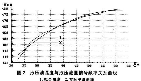 因?yàn)橐陨显囼?yàn)是在液壓油流量變化的情況下測得, 如果要分析液壓油溫度對流量信號頻率的影響, 就必須將液壓油流量信號頻率修正到某一不變的流量下( 如52 .07L/ m i n 。流量信號頻率修正后, 如表2 所示。根據(jù)表2 對液壓油流量信號頻率的修正, 使用計(jì)算機(jī)繪制出液壓油溫度與液壓流量信號頻率之間的關(guān)系如圖2 中的曲線2 所示。