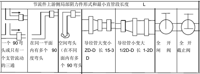 節(jié)流裝置的安裝和適用于下列管段和管件有關(guān):節(jié)流件上游側(cè)*一阻力件、*二阻力件,節(jié)流件下右側(cè)*一阻力件,從節(jié)流件上游*二阻力件到下游*一阻力件之間的管段以及差壓訊號管路等。